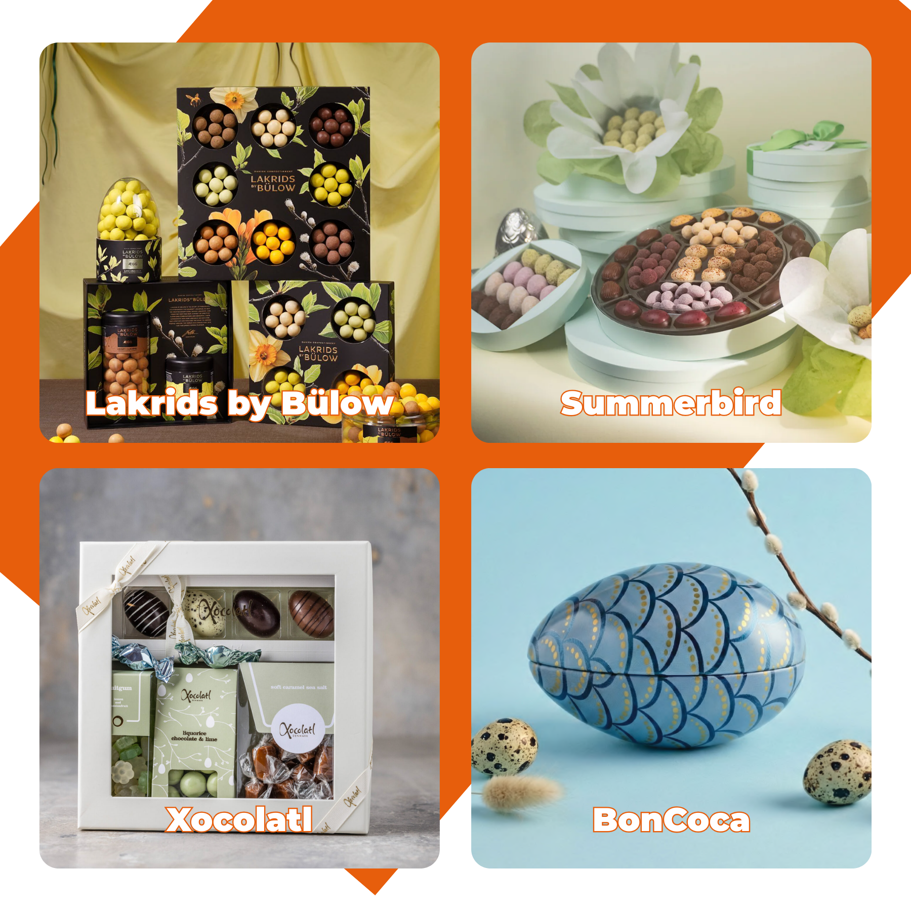 Hvis du vil bestille påskegaver fra Summerbird, Lakrids by Bülow, Xocolatl, Bon Coca, Func, Lakridseriet, Ole Chokolade eller Cocoture, kan The Branding Company hjælpe med valg af produkter, mængder og levering.