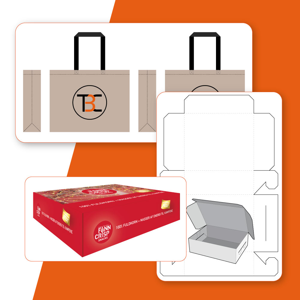 Vores grafiske team udvikler et design, der afspejler din virksomheds identitet. Har du allerede et eksisterende design, kan vi tilpasse det til de specifikke mål og formater, emballagen kræver.